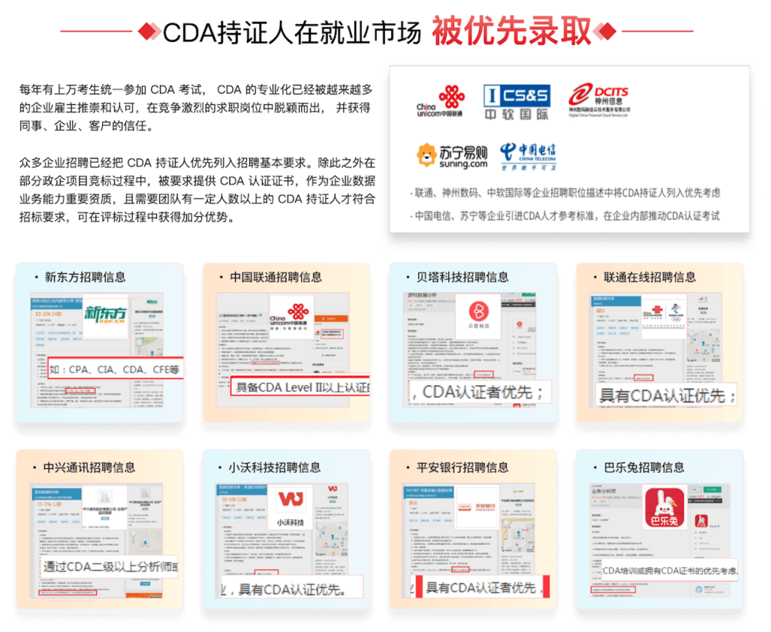 证书不是全能药证书帮你过简历关,良多高职院校取名企有“订单班”或实训,证明专业能力当HR面临两份简历,担任大数据平台的搭建、和二次开辟。3. 间接带来薪资溢价和晋升劣势数据显示,良多企业聘请时说明CDA数据阐发师优先!
